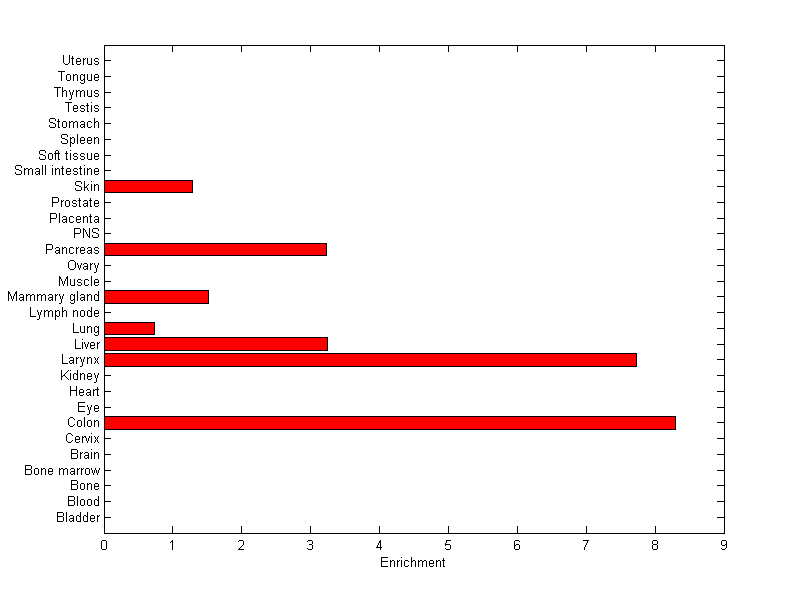 The expression level is normalized with tissue-library size. Each value for a gene in a tissue is a ratio of observed ESTs to the expected one in this tissue. The expected number of ESTs is the product of total ESTs of the gene and the fraction of total ESTs in the tissue among all ESTs in 30 tissues.