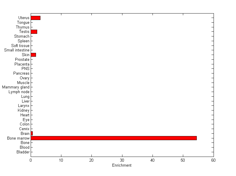 The expression level is normalized with tissue-library size. Each value for a gene in a tissue is a ratio of observed ESTs to the expected one in this tissue. The expected number of ESTs is the product of total ESTs of the gene and the fraction of total ESTs in the tissue among all ESTs in 30 tissues.