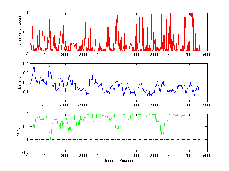 The energy profile (green curve) is about energy for module detection based on TF interaction. The positions with energy less than -1 indicate the existence of CRMs.
