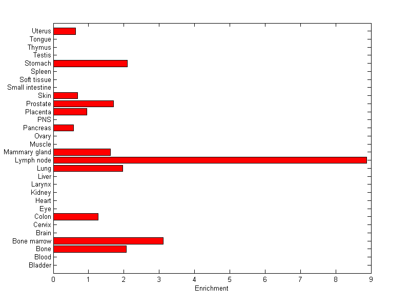 The expression level is normalized with tissue-library size. Each value for a gene in a tissue is a ratio of observed ESTs to the expected one in this tissue. The expected number of ESTs is the product of total ESTs of the gene and the fraction of total ESTs in the tissue among all ESTs in 30 tissues.