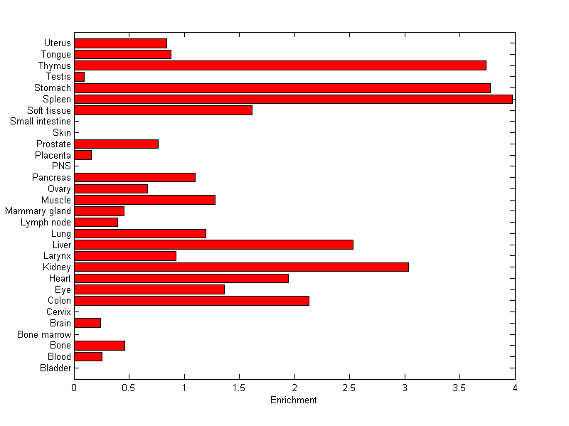 The expression level is normalized with tissue-library size. Each value for a gene in a tissue is a ratio of observed ESTs to the expected one in this tissue. The expected number of ESTs is the product of total ESTs of the gene and the fraction of total ESTs in the tissue among all ESTs in 30 tissues.