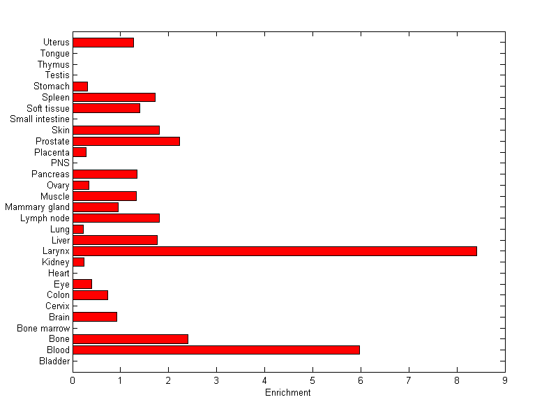 The expression level is normalized with tissue-library size. Each value for a gene in a tissue is a ratio of observed ESTs to the expected one in this tissue. The expected number of ESTs is the product of total ESTs of the gene and the fraction of total ESTs in the tissue among all ESTs in 30 tissues.