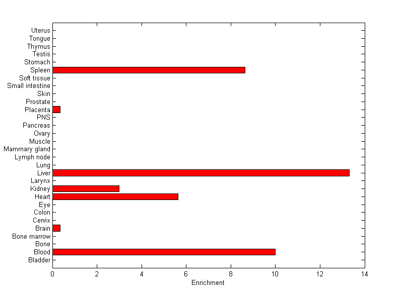 About the profile: The expression level is normalized with tissue-library size. Each value for a gene in a tissue is a ratio of observed ESTs to the expected one in this tissue. The expected number of ESTs is the product of total ESTs of the gene and the fraction of total ESTs in the tissue among all ESTs in 30 tissues. Summary: This gene is preferentially expressed in [blood, liver] Download: |