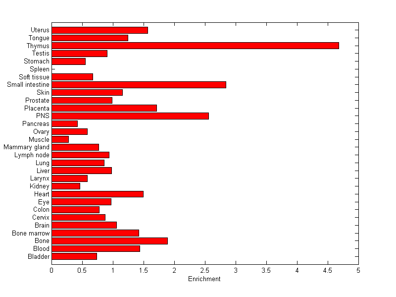 The expression level is normalized with tissue-library size. Each value for a gene in a tissue is a ratio of observed ESTs to the expected one in this tissue. The expected number of ESTs is the product of total ESTs of the gene and the fraction of total ESTs in the tissue among all ESTs in 30 tissues.