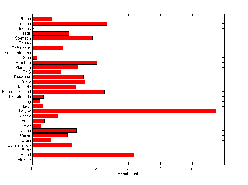 About the profile: The expression level is normalized with tissue-library size. Each value for a gene in a tissue is a ratio of observed ESTs to the expected one in this tissue. The expected number of ESTs is the product of total ESTs of the gene and the fraction of total ESTs in the tissue among all ESTs in 30 tissues. Summary: This gene is preferentially expressed in [larynx] Download: |
