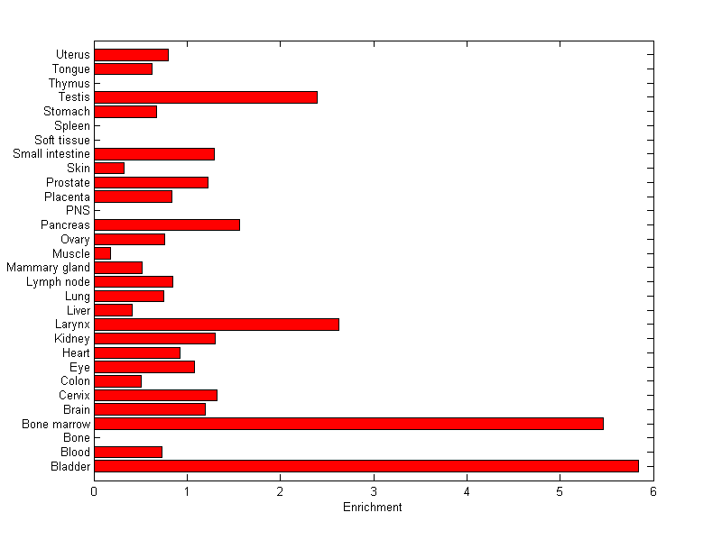 About the profile: The expression level is normalized with tissue-library size. Each value for a gene in a tissue is a ratio of observed ESTs to the expected one in this tissue. The expected number of ESTs is the product of total ESTs of the gene and the fraction of total ESTs in the tissue among all ESTs in 30 tissues. Summary: This gene is preferentially expressed in [bladder, bone_marrow] Download: |