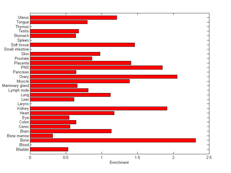 The expression level is normalized with tissue-library size. Each value for a gene in a tissue is a ratio of observed ESTs to the expected one in this tissue. The expected number of ESTs is the product of total ESTs of the gene and the fraction of total ESTs in the tissue among all ESTs in 30 tissues.