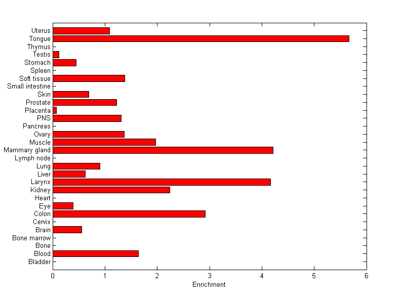 The expression level is normalized with tissue-library size. Each value for a gene in a tissue is a ratio of observed ESTs to the expected one in this tissue. The expected number of ESTs is the product of total ESTs of the gene and the fraction of total ESTs in the tissue among all ESTs in 30 tissues.