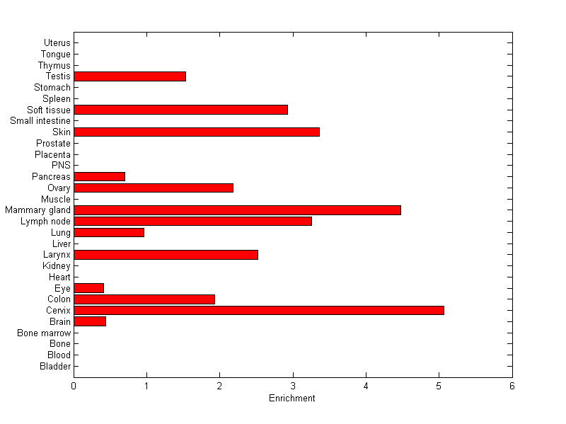 The expression level is normalized with tissue-library size. Each value for a gene in a tissue is a ratio of observed ESTs to the expected one in this tissue. The expected number of ESTs is the product of total ESTs of the gene and the fraction of total ESTs in the tissue among all ESTs in 30 tissues.