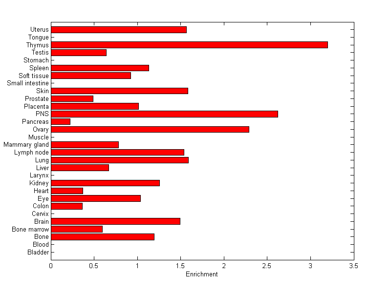 The expression level is normalized with tissue-library size. Each value for a gene in a tissue is a ratio of observed ESTs to the expected one in this tissue. The expected number of ESTs is the product of total ESTs of the gene and the fraction of total ESTs in the tissue among all ESTs in 30 tissues.