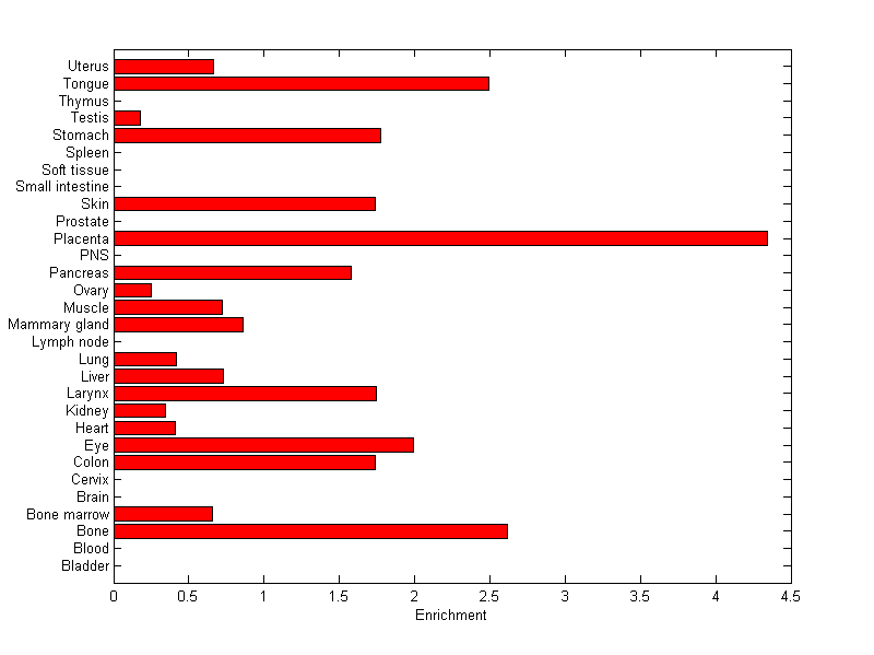 The expression level is normalized with tissue-library size. Each value for a gene in a tissue is a ratio of observed ESTs to the expected one in this tissue. The expected number of ESTs is the product of total ESTs of the gene and the fraction of total ESTs in the tissue among all ESTs in 30 tissues.