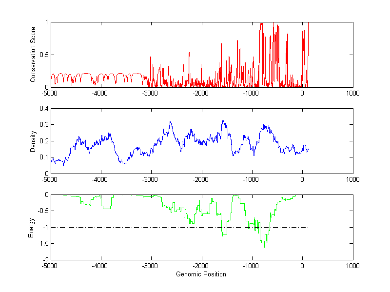 The energy profile (green curve) is about energy for module detection based on TF interaction. The positions with energy less than -1 indicate the existence of CRMs.