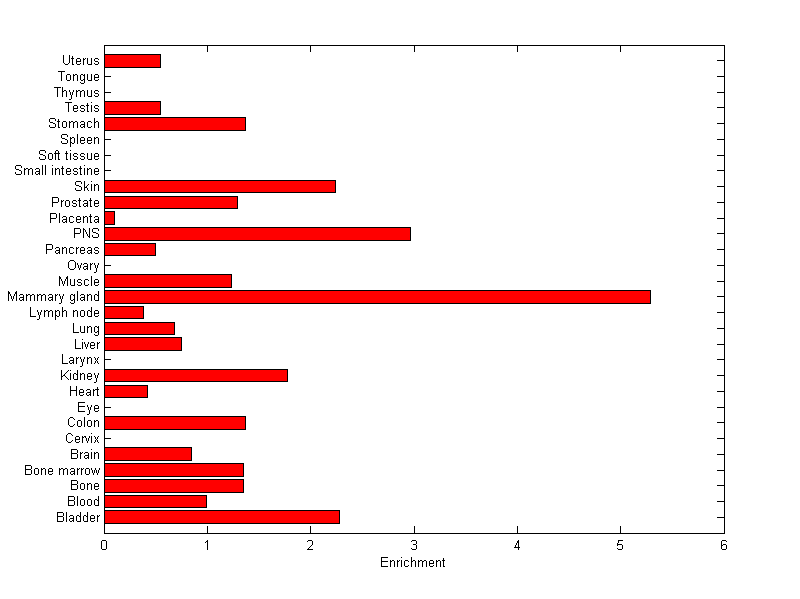 The expression level is normalized with tissue-library size. Each value for a gene in a tissue is a ratio of observed ESTs to the expected one in this tissue. The expected number of ESTs is the product of total ESTs of the gene and the fraction of total ESTs in the tissue among all ESTs in 30 tissues.