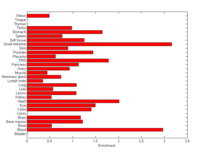 The expression level is normalized with tissue-library size. Each value for a gene in a tissue is a ratio of observed ESTs to the expected one in this tissue. The expected number of ESTs is the product of total ESTs of the gene and the fraction of total ESTs in the tissue among all ESTs in 30 tissues.