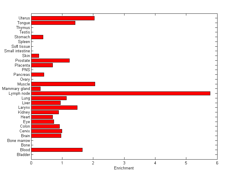 The expression level is normalized with tissue-library size. Each value for a gene in a tissue is a ratio of observed ESTs to the expected one in this tissue. The expected number of ESTs is the product of total ESTs of the gene and the fraction of total ESTs in the tissue among all ESTs in 30 tissues.