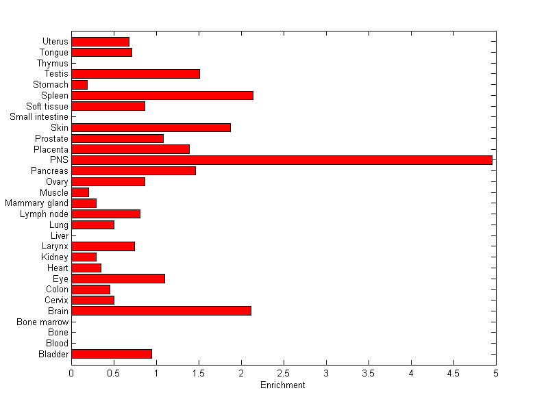 The expression level is normalized with tissue-library size. Each value for a gene in a tissue is a ratio of observed ESTs to the expected one in this tissue. The expected number of ESTs is the product of total ESTs of the gene and the fraction of total ESTs in the tissue among all ESTs in 30 tissues.
