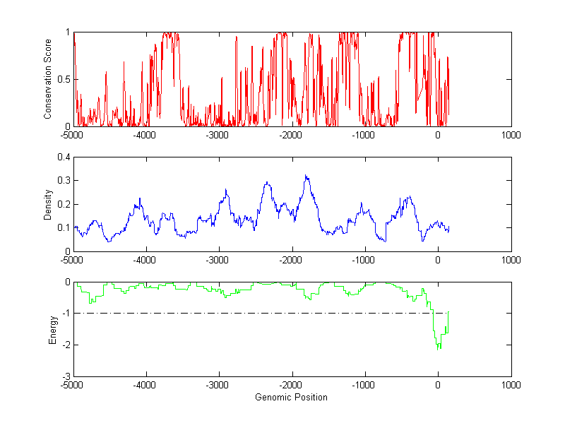 About the profiles: The conservation profile (red curve) is about conservation scores of the promoter sequences. Conservation was determined from an eight-way alignment of human, chimpanzee, dog, mouse, rat, chicken, zebrafish and fugu sequences. The conservation was quantified by a conservation score between 0 and 1, with 1 as highest conservation. The conservation score was obtained from UCSC genome databases. The density profile (blue curve) is about density of all TF binding sites. The energy profile (green curve) is about energy for module detection based on TF interaction. The positions with energy less than -1 indicate the existence of CRMs. Download: Conservation profileDensity profile Energy profile CRM summary |