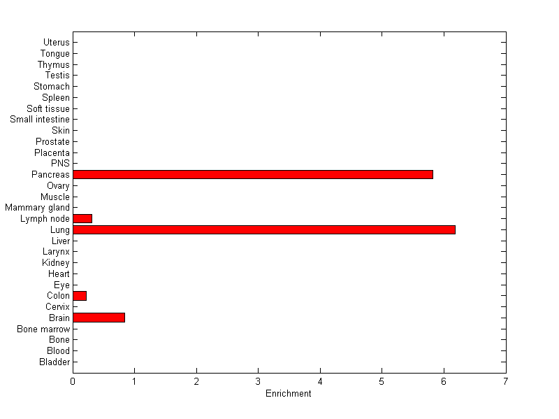 About the profile: The expression level is normalized with tissue-library size. Each value for a gene in a tissue is a ratio of observed ESTs to the expected one in this tissue. The expected number of ESTs is the product of total ESTs of the gene and the fraction of total ESTs in the tissue among all ESTs in 30 tissues. Summary: This gene is preferentially expressed in [lung, pancreas] Download: |