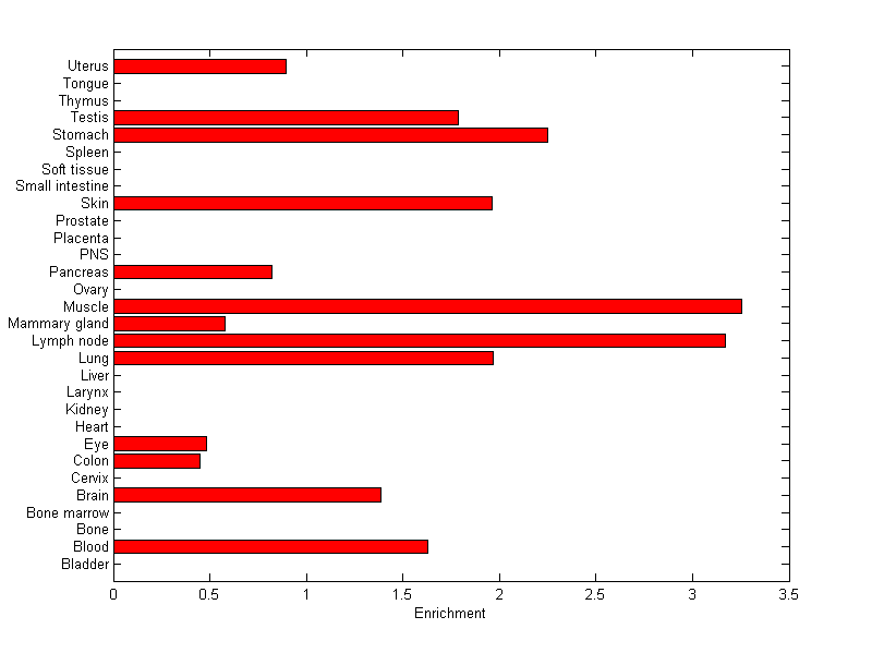 The expression level is normalized with tissue-library size. Each value for a gene in a tissue is a ratio of observed ESTs to the expected one in this tissue. The expected number of ESTs is the product of total ESTs of the gene and the fraction of total ESTs in the tissue among all ESTs in 30 tissues.