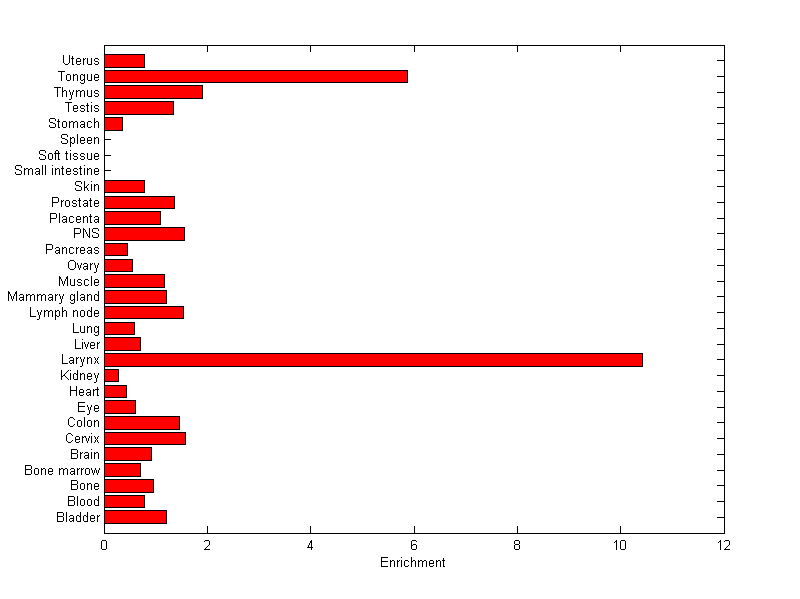 The expression level is normalized with tissue-library size. Each value for a gene in a tissue is a ratio of observed ESTs to the expected one in this tissue. The expected number of ESTs is the product of total ESTs of the gene and the fraction of total ESTs in the tissue among all ESTs in 30 tissues.
