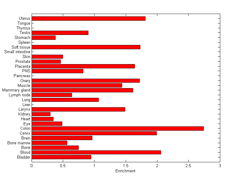 The expression level is normalized with tissue-library size. Each value for a gene in a tissue is a ratio of observed ESTs to the expected one in this tissue. The expected number of ESTs is the product of total ESTs of the gene and the fraction of total ESTs in the tissue among all ESTs in 30 tissues.