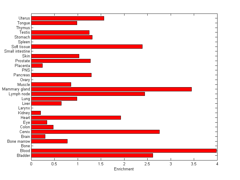 The expression level is normalized with tissue-library size. Each value for a gene in a tissue is a ratio of observed ESTs to the expected one in this tissue. The expected number of ESTs is the product of total ESTs of the gene and the fraction of total ESTs in the tissue among all ESTs in 30 tissues.