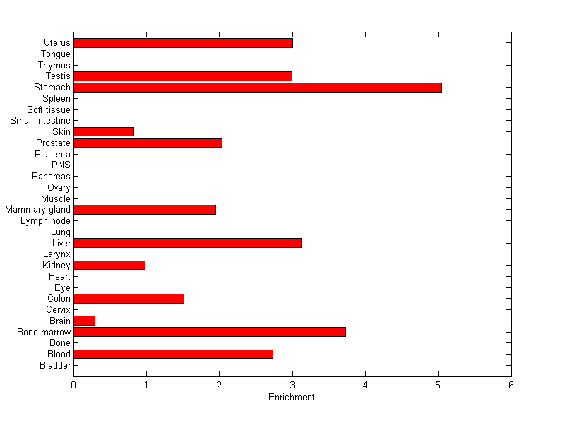 The expression level is normalized with tissue-library size. Each value for a gene in a tissue is a ratio of observed ESTs to the expected one in this tissue. The expected number of ESTs is the product of total ESTs of the gene and the fraction of total ESTs in the tissue among all ESTs in 30 tissues.