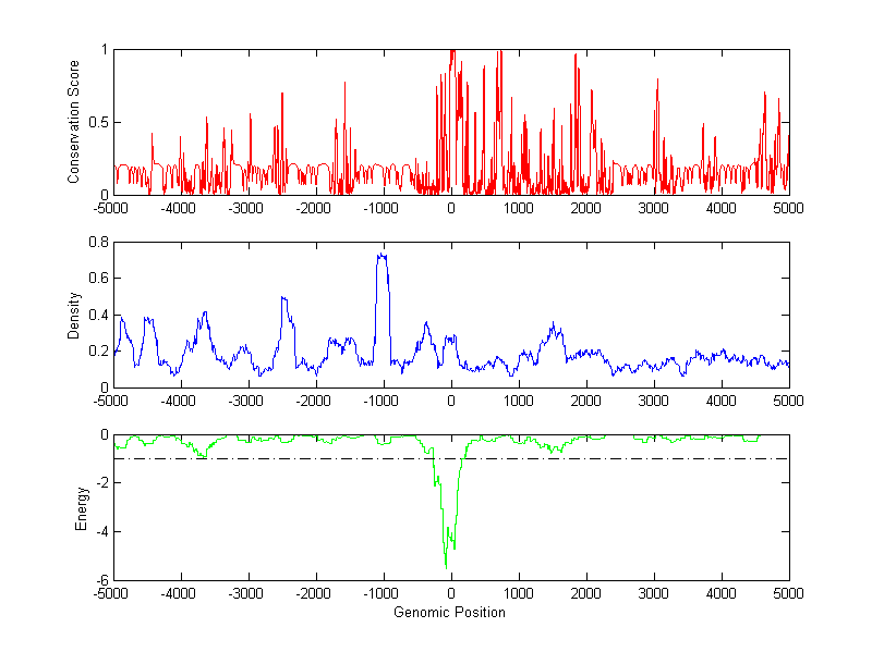 The energy profile (green curve) is about energy for module detection based on TF interaction. The positions with energy less than -1 indicate the existence of CRMs.
