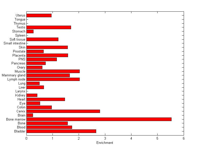 The expression level is normalized with tissue-library size. Each value for a gene in a tissue is a ratio of observed ESTs to the expected one in this tissue. The expected number of ESTs is the product of total ESTs of the gene and the fraction of total ESTs in the tissue among all ESTs in 30 tissues.