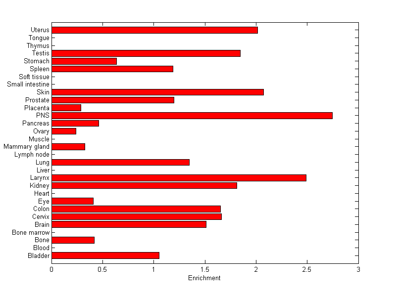 The expression level is normalized with tissue-library size. Each value for a gene in a tissue is a ratio of observed ESTs to the expected one in this tissue. The expected number of ESTs is the product of total ESTs of the gene and the fraction of total ESTs in the tissue among all ESTs in 30 tissues.