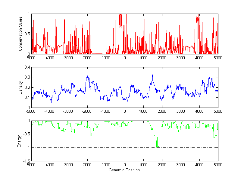 The energy profile (green curve) is about energy for module detection based on TF interaction. The positions with energy less than -1 indicate the existence of CRMs.