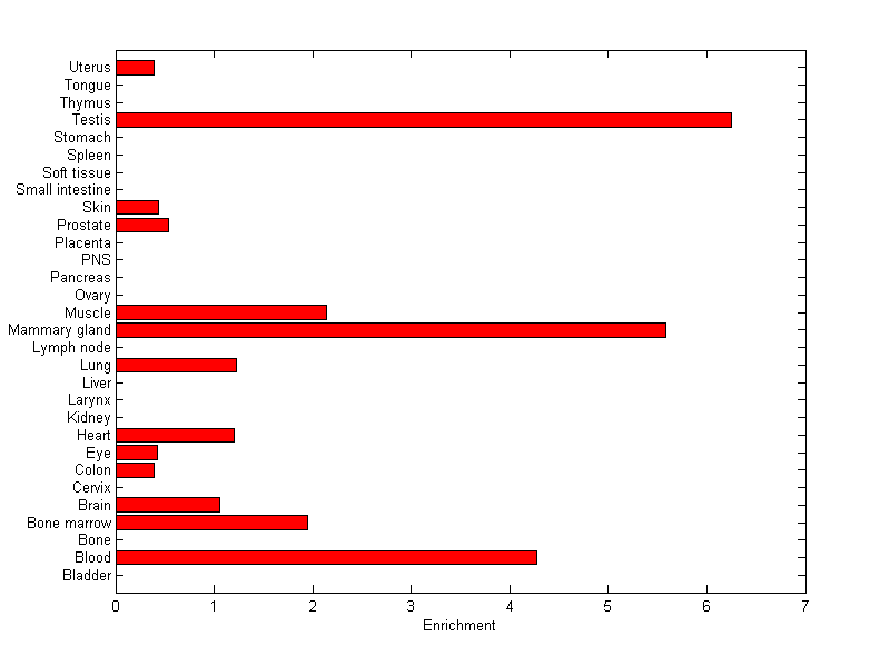 The expression level is normalized with tissue-library size. Each value for a gene in a tissue is a ratio of observed ESTs to the expected one in this tissue. The expected number of ESTs is the product of total ESTs of the gene and the fraction of total ESTs in the tissue among all ESTs in 30 tissues.