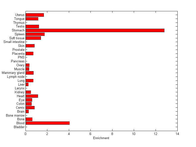 The expression level is normalized with tissue-library size. Each value for a gene in a tissue is a ratio of observed ESTs to the expected one in this tissue. The expected number of ESTs is the product of total ESTs of the gene and the fraction of total ESTs in the tissue among all ESTs in 30 tissues.