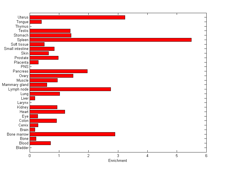 The expression level is normalized with tissue-library size. Each value for a gene in a tissue is a ratio of observed ESTs to the expected one in this tissue. The expected number of ESTs is the product of total ESTs of the gene and the fraction of total ESTs in the tissue among all ESTs in 30 tissues.