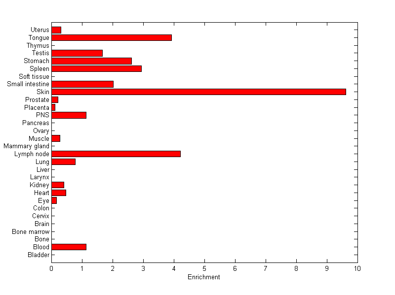 The expression level is normalized with tissue-library size. Each value for a gene in a tissue is a ratio of observed ESTs to the expected one in this tissue. The expected number of ESTs is the product of total ESTs of the gene and the fraction of total ESTs in the tissue among all ESTs in 30 tissues.