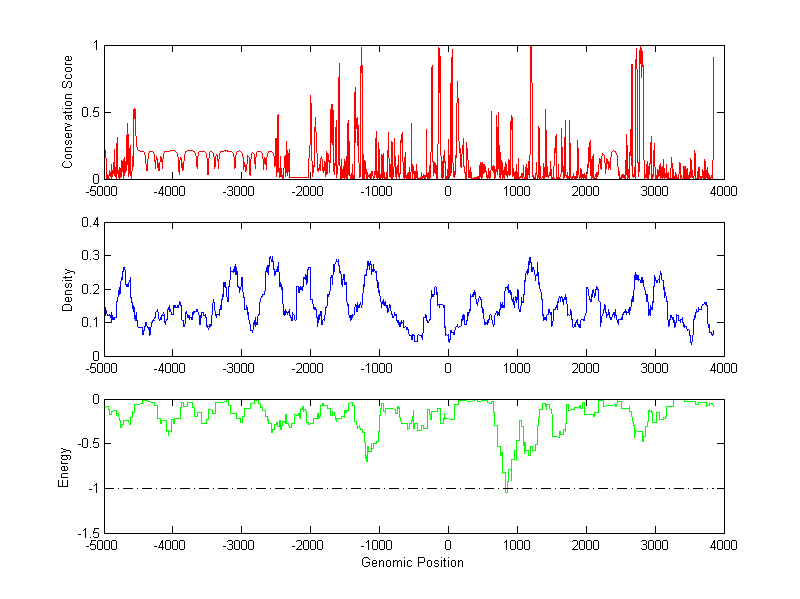 The energy profile (green curve) is about energy for module detection based on TF interaction. The positions with energy less than -1 indicate the existence of CRMs.