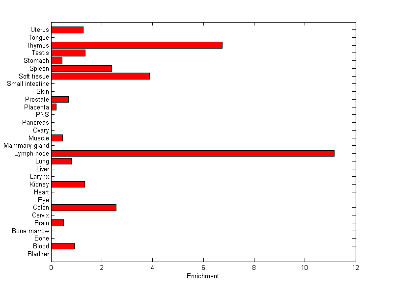 The expression level is normalized with tissue-library size. Each value for a gene in a tissue is a ratio of observed ESTs to the expected one in this tissue. The expected number of ESTs is the product of total ESTs of the gene and the fraction of total ESTs in the tissue among all ESTs in 30 tissues.
