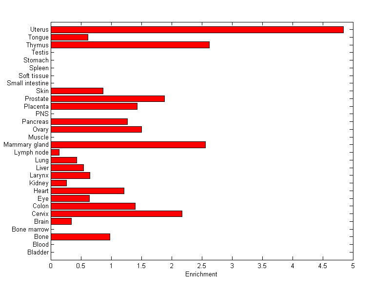 The expression level is normalized with tissue-library size. Each value for a gene in a tissue is a ratio of observed ESTs to the expected one in this tissue. The expected number of ESTs is the product of total ESTs of the gene and the fraction of total ESTs in the tissue among all ESTs in 30 tissues.