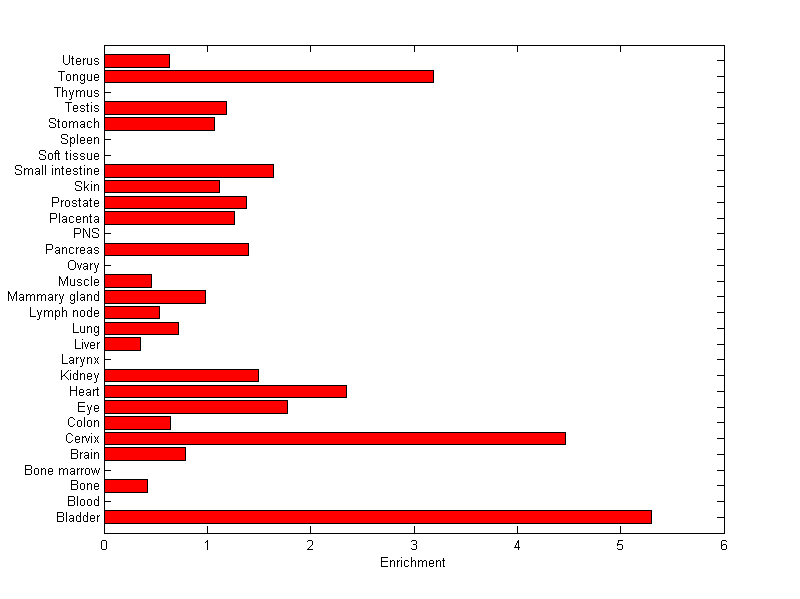 The expression level is normalized with tissue-library size. Each value for a gene in a tissue is a ratio of observed ESTs to the expected one in this tissue. The expected number of ESTs is the product of total ESTs of the gene and the fraction of total ESTs in the tissue among all ESTs in 30 tissues.