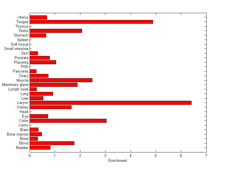 The expression level is normalized with tissue-library size. Each value for a gene in a tissue is a ratio of observed ESTs to the expected one in this tissue. The expected number of ESTs is the product of total ESTs of the gene and the fraction of total ESTs in the tissue among all ESTs in 30 tissues.
