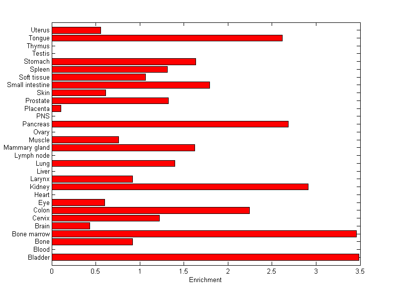The expression level is normalized with tissue-library size. Each value for a gene in a tissue is a ratio of observed ESTs to the expected one in this tissue. The expected number of ESTs is the product of total ESTs of the gene and the fraction of total ESTs in the tissue among all ESTs in 30 tissues.
