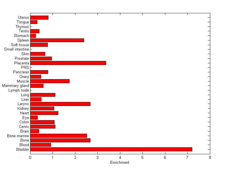 The expression level is normalized with tissue-library size. Each value for a gene in a tissue is a ratio of observed ESTs to the expected one in this tissue. The expected number of ESTs is the product of total ESTs of the gene and the fraction of total ESTs in the tissue among all ESTs in 30 tissues.