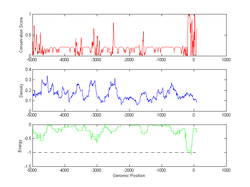About the profiles: The conservation profile (red curve) is about conservation scores of the promoter sequences. Conservation was determined from an eight-way alignment of human, chimpanzee, dog, mouse, rat, chicken, zebrafish and fugu sequences. The conservation was quantified by a conservation score between 0 and 1, with 1 as highest conservation. The conservation score was obtained from UCSC genome databases. The density profile (blue curve) is about density of all TF binding sites. The energy profile (green curve) is about energy for module detection based on TF interaction. The positions with energy less than -1 indicate the existence of CRMs. Download: Conservation profileDensity profile Energy profile CRM summary |