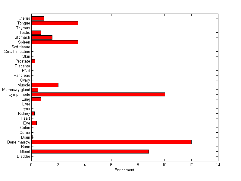 About the profile: The expression level is normalized with tissue-library size. Each value for a gene in a tissue is a ratio of observed ESTs to the expected one in this tissue. The expected number of ESTs is the product of total ESTs of the gene and the fraction of total ESTs in the tissue among all ESTs in 30 tissues. Summary: This gene is preferentially expressed in [blood, bone_marrow, lymph_node] Download: |