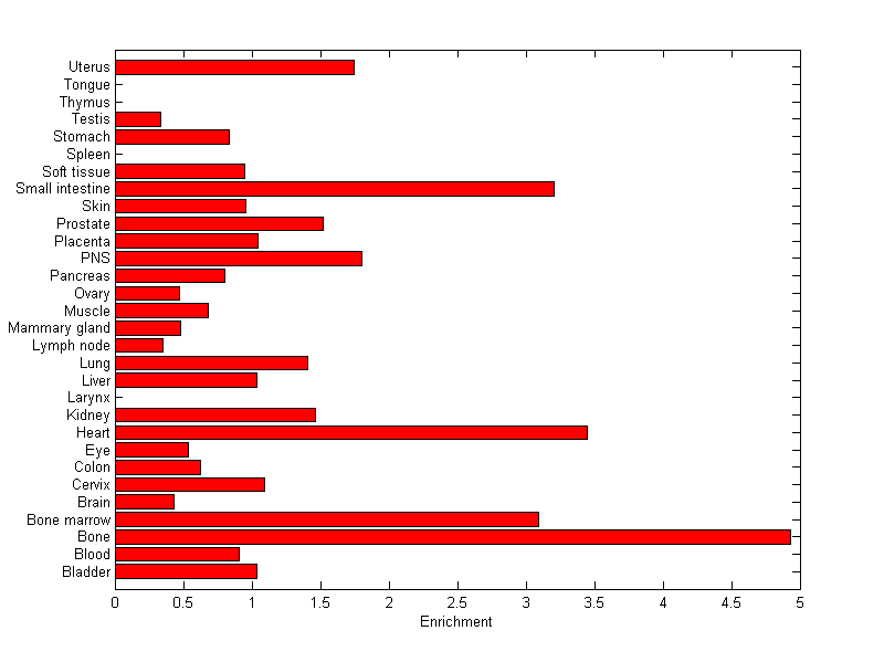 The expression level is normalized with tissue-library size. Each value for a gene in a tissue is a ratio of observed ESTs to the expected one in this tissue. The expected number of ESTs is the product of total ESTs of the gene and the fraction of total ESTs in the tissue among all ESTs in 30 tissues.