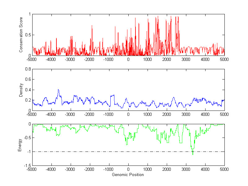 About the profiles: The conservation profile (red curve) is about conservation scores of the promoter sequences. Conservation was determined from an eight-way alignment of human, chimpanzee, dog, mouse, rat, chicken, zebrafish and fugu sequences. The conservation was quantified by a conservation score between 0 and 1, with 1 as highest conservation. The conservation score was obtained from UCSC genome databases. The density profile (blue curve) is about density of all TF binding sites. The energy profile (green curve) is about energy for module detection based on TF interaction. The positions with energy less than -1 indicate the existence of CRMs. Download: Conservation profileDensity profile Energy profile CRM summary |