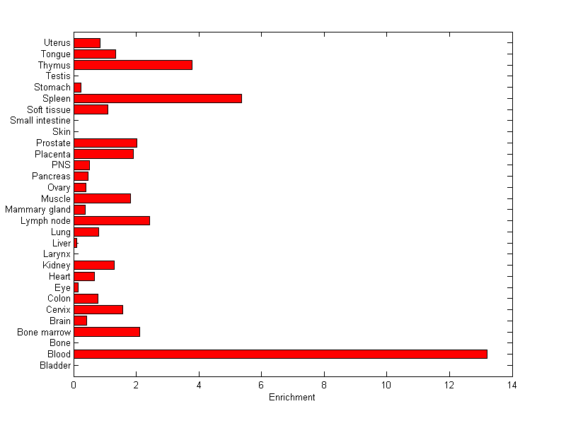 About the profile: The expression level is normalized with tissue-library size. Each value for a gene in a tissue is a ratio of observed ESTs to the expected one in this tissue. The expected number of ESTs is the product of total ESTs of the gene and the fraction of total ESTs in the tissue among all ESTs in 30 tissues. Summary: This gene is preferentially expressed in [blood, spleen] Download: |