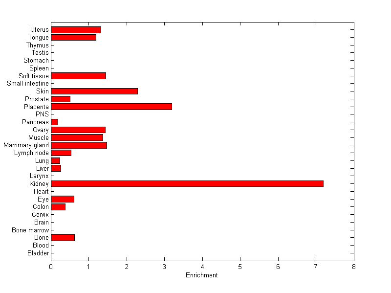 The expression level is normalized with tissue-library size. Each value for a gene in a tissue is a ratio of observed ESTs to the expected one in this tissue. The expected number of ESTs is the product of total ESTs of the gene and the fraction of total ESTs in the tissue among all ESTs in 30 tissues.