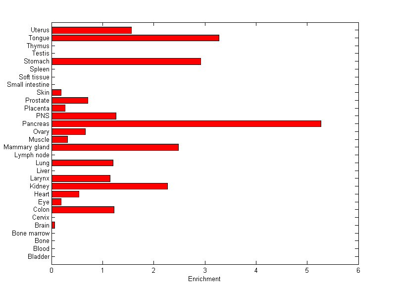 The expression level is normalized with tissue-library size. Each value for a gene in a tissue is a ratio of observed ESTs to the expected one in this tissue. The expected number of ESTs is the product of total ESTs of the gene and the fraction of total ESTs in the tissue among all ESTs in 30 tissues.