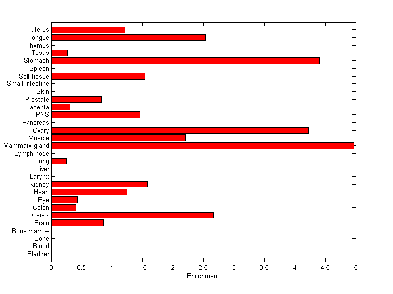The expression level is normalized with tissue-library size. Each value for a gene in a tissue is a ratio of observed ESTs to the expected one in this tissue. The expected number of ESTs is the product of total ESTs of the gene and the fraction of total ESTs in the tissue among all ESTs in 30 tissues.